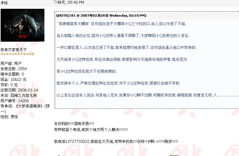 QUOTE(181 @ 2007年03月04日 Sunday, 02:40 AM) 我可以肯定的讲.我刁完你老母.再对你说.对不起你.你去死吧小Q.我是不会放过你的.你小心为重.注:行出大天地小心刀落. [snapback]1688703[/snapback] 原来是国仁的朋友,国仁也是我兄弟,电白很大,世界真小 这场争吵就算了吧 还要闹下去的话,只会让彼此尴尬...