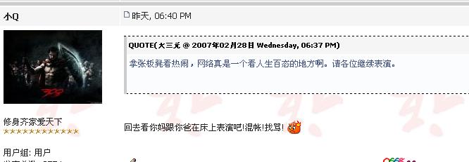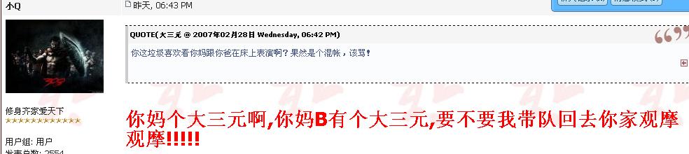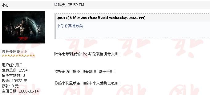 wwwww 小学二年级 注册 2007-02-23 消息 187 反馈评分 0 点数 0 2007-03-04 #84 QUOTE(小Q @ 2007年03月04日 Sunday, 02:02 PM) 大众麻将馆,再JJYY的话,小心把你连根拔起 [snapback]1689070[/snapback] 看到你这个疯狗在发疯就气愤,我不认识什么麻将馆,我不是你想象的那个,我和你没有什么恩怨,看到你这个疯狗在这里咬人我就气愤,你不要以为你很了不起,我回到水东第一时间就去收拾你这个垃圾.替电白清理垃圾.