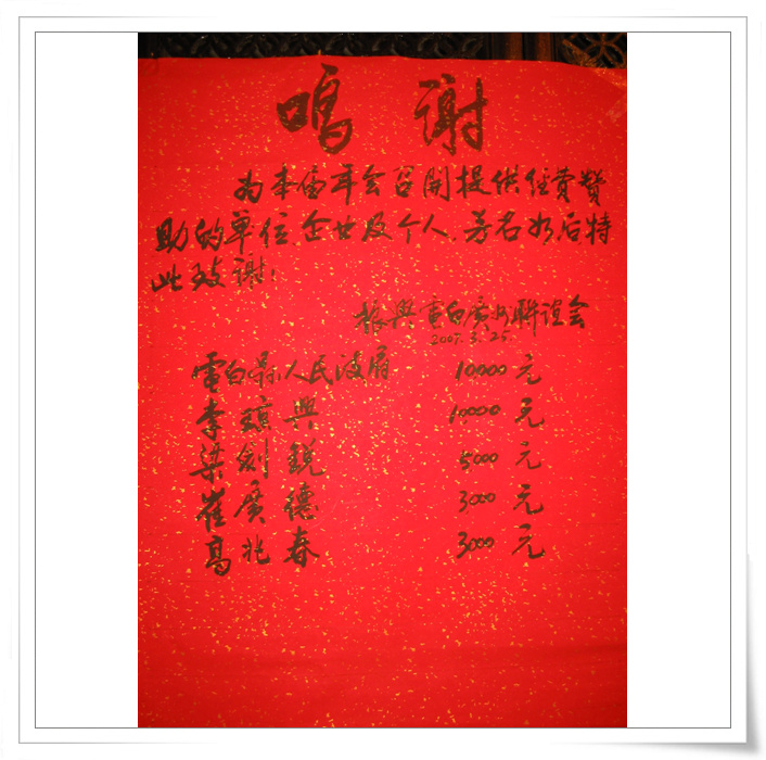 本次大会经费由电白县政府、李琼兴、梁钊锐、崔广德、高兆春等单位和个人赞助;郑文、郑龙辉、崔真基、崔大洪等赞助了本次大会文艺演出经费;晚宴啤酒由珠江啤酒集团副总经理李光提供。