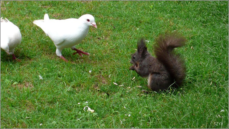 推土机~看到松鼠在吃什么好东西,鸽子那个馋啊