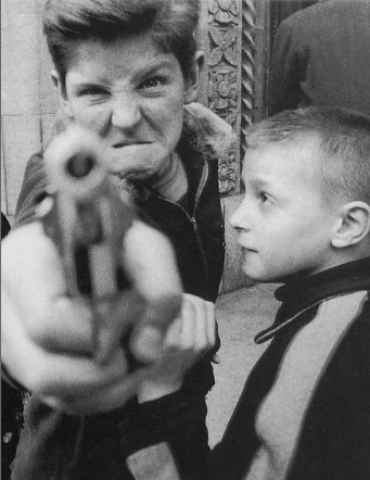 一个小流氓正在街上玩持枪射击的游戏。但其瞬间无意识流露出来的狰狞,己失去了少儿的天性,暴露出一个少儿心底深藏的****。