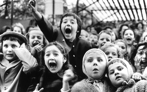 一群少儿,面时露天木偶戏表演中的一个惊恐片断,呈现出不同的神态。有惊骇而叫的,有目瞪口呆的,有捂耳定神的,有斜依漠然的。各色神态即h异又交溶,可谓神来之拍!