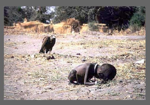 一个因饥饿而即将死去的女童。虽然我们没有看到她的面部表情,但那无力支撑而倒地的扭曲的身体,分明在向我们诉说着她的无爱与无助,诉说着她的痛苦与茫然…只有@鹰在听她的诉说,并极不耐烦的等待着…震撼的画面,人类的悲剧!