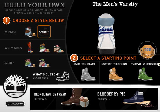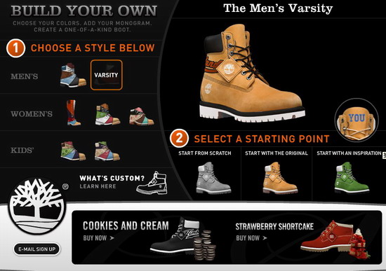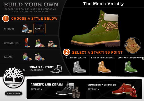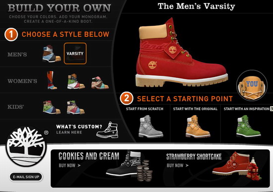 五彩缤纷的Timberland:如今随着个性化需求的深入及普及,越来越多的年轻人渴望拥有与众不同的产品。Timberland的个性定制服务无疑满足了很多人对个性的追逐,登陆Timberland的官方网站,人们可以根据自己的喜好选择各种物料以及配色组成的DIY皮靴。