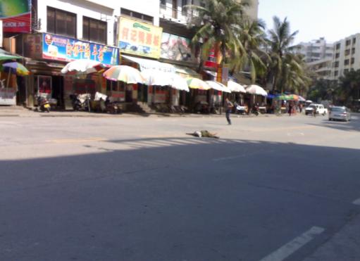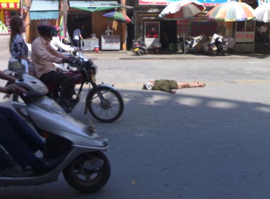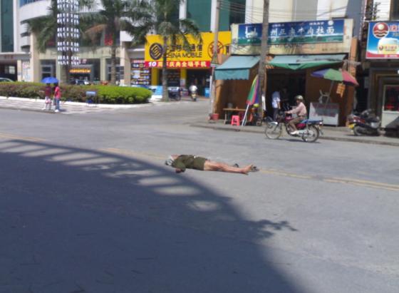 我那天也看见了。。。我以为死了人呢。。。还有一部小车在旁边呢。。。走过去后问下人。。怎么回事。。才知道是疯子。。。。