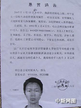与此同时,当地警方更四处张贴悬赏通告,以人民币三万元的高额奖励呼吁广大市民举报线索,帮助公安机关缉拿杀人凶手。