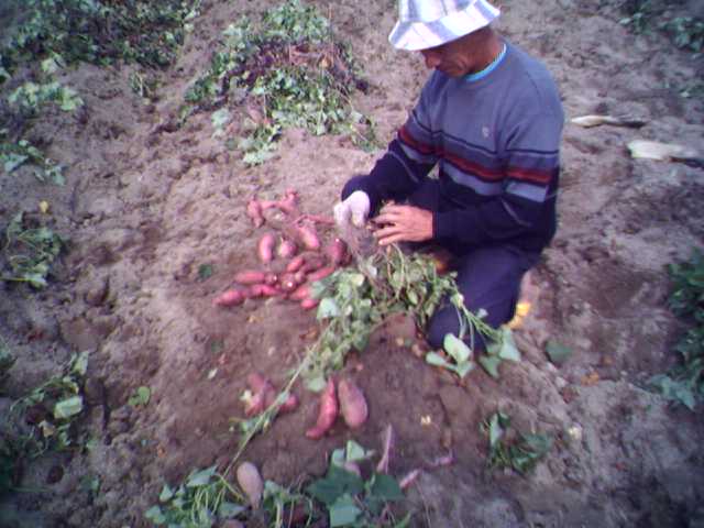 农民在挖蕃薯。这些蕃薯是在六月拔花生后种的。