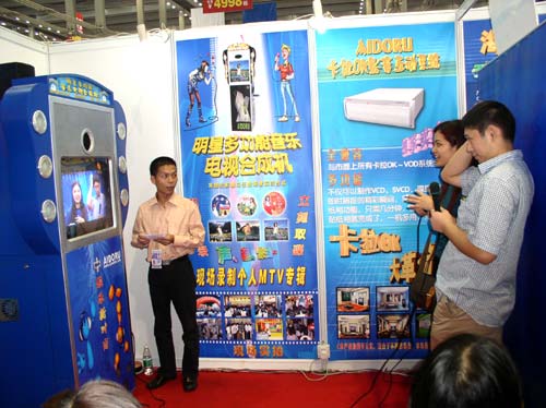 ●占地很小,经营方式灵活,操作简单。演唱者站在蓝色背景幕前,摄像机对他进行录像,系统实时进行抠像,换背景,字幕叠加,动态前景装饰,演唱者在演唱的同时可以通过对面的电视看到自己的演唱和已叠加完美背景的效果,可以随时根据背景调整自己的表情和动作。这些背景有图片,也有视频文件,比如绚丽的世界风光,奇妙的海底世界,也可以是电影片段或卡通。动态前景装饰丰富漂亮,比如彩蝶飞舞、礼花满天、阳光闪耀水波荡漾等,营造出梦幻视觉效果。这一切都是同步进行的,无需等待,即刻就可以拿到一张自己演唱,并配以神奇背景的MTV光盘。