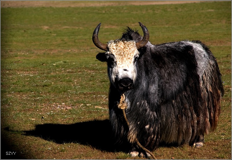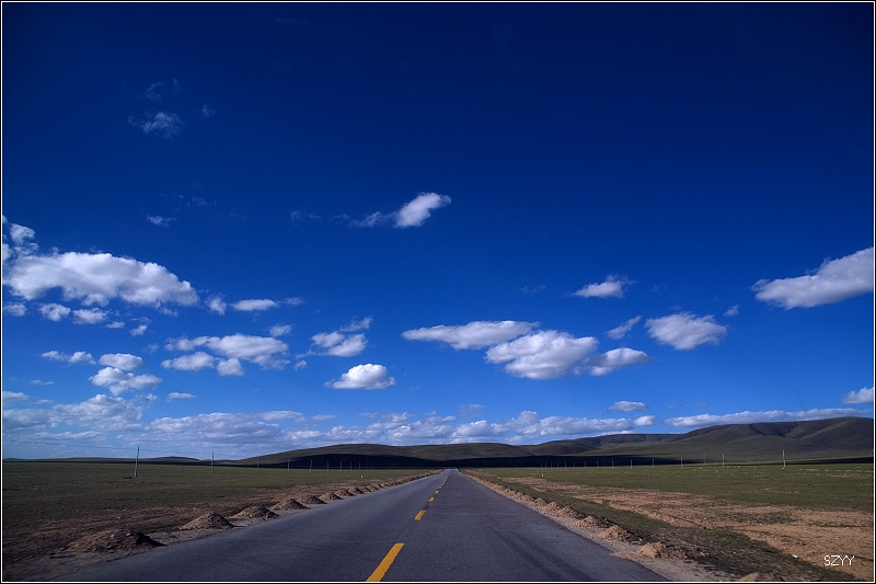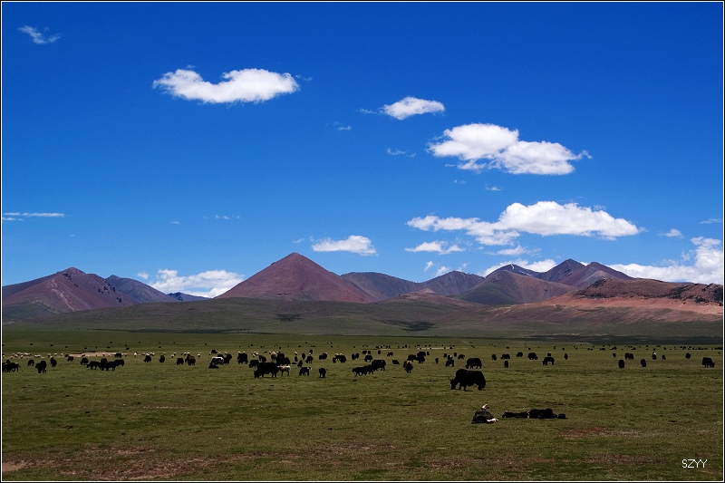 很想离开路基在草原上飞驰,可是又怕压坏了草皮,仔细看看有车辙,是牧民开车走的地方,我们也就大着胆子离开公路开到了草原上,草原上有很多散放的牦牛、马和羊,不知名的鸟离我们只有一两米都不飞。开了一段,到了牧民跟前,我们又沿着车辙重新回到公路上。