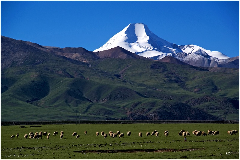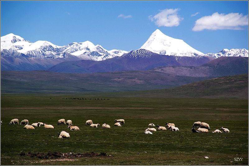 下山,眼前豁然开朗,一大片平坦的草原展现在眼前,两侧的雪山离的很远,整个草原上就只有我们一辆车,不由得让人想高速狂奔。