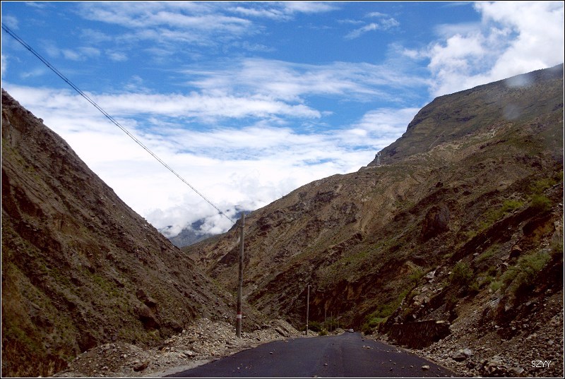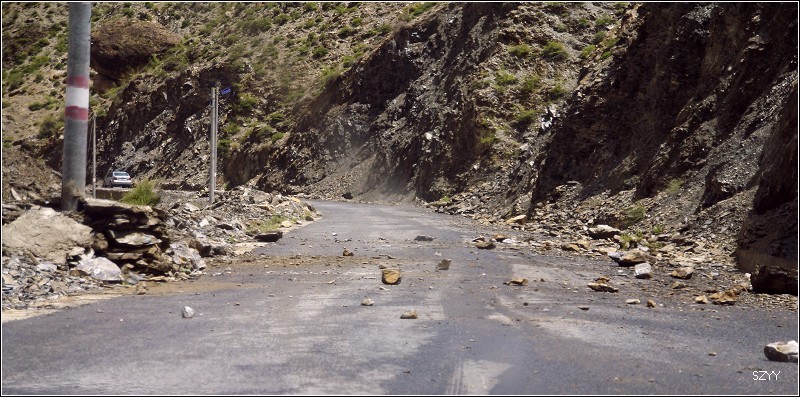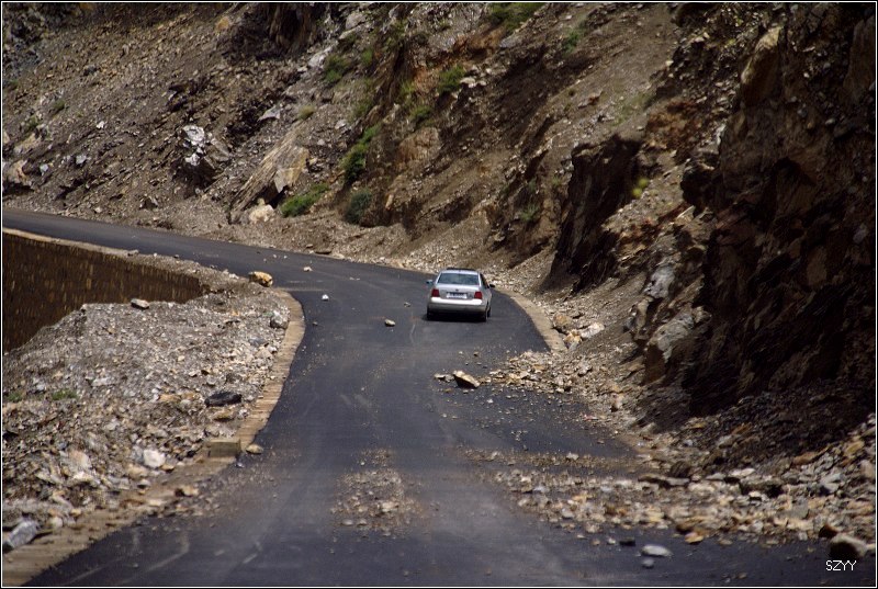 推土机 荣誉会员 荣誉会员 注册 2004-11-28 帖子 2,034 反馈评分 0 点数 61 2007-08-18 #157 不久,遇到一处山体滑坡,在路面上堆起一个大土包,显然是新塌下来的,上面只有一两辆大车压过的车辙,我们三人下了车观察是否能通过,感觉还行,就示意北方郎可以过,老严在前面指挥,老郎小心翼翼地开了过来,宝来有些蹭底,丰田4500由于后面下部带了一个备用轮胎,所以是一直蹭着土包过来的。由于下了多天的雨,山体非常疏松,峭壁两侧的巨石面部狰狞,随时都有砸下来的可能。进入金沙江大峡谷,虽然景色壮美,但是我们心情比较紧张,只是在行驶的车上偶尔拍几张记录照,路面上塌方的石头越来越多,路越来越窄,一面是奔腾咆哮混浊的金沙江,另一面是危机四伏的悬崖峭壁,路上到底见到多少塌方的地方已经无法计数,我们甚至好像逃命一般,遇到危险的路段就小心快速通过。路面上有的大石头跟半个汽车般大小,我们的车只能小心从侧面挤过去。