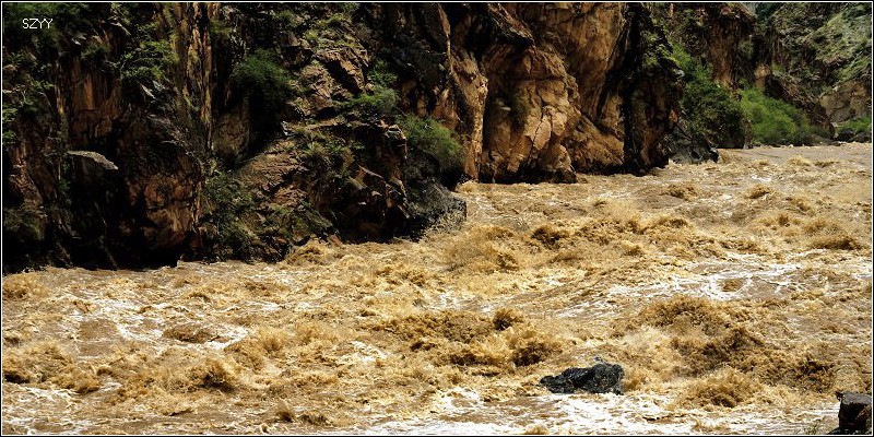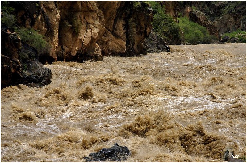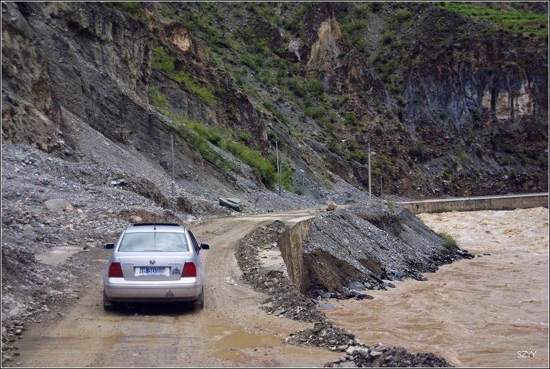 不久,遇到一处山体滑坡,在路面上堆起一个大土包,显然是新塌下来的,上面只有一两辆大车压过的车辙,我们三人下了车观察是否能通过,感觉还行,就示意北方郎可以过,老严在前面指挥,老郎小心翼翼地开了过来,宝来有些蹭底,丰田4500由于后面下部带了一个备用轮胎,所以是一直蹭着土包过来的。由于下了多天的雨,山体非常疏松,峭壁两侧的巨石面部狰狞,随时都有砸下来的可能。进入金沙江大峡谷,虽然景色壮美,但是我们心情比较紧张,只是在行驶的车上偶尔拍几张记录照,路面上塌方的石头越来越多,路越来越窄,一面是奔腾咆哮混浊的金沙江,另一面是危机四伏的悬崖峭壁,路上到底见到多少塌方的地方已经无法计数,我们甚至好像逃命一般,遇到危险的路段就小心快速通过。路面上有的大石头跟半个汽车般大小,我们的车只能小心从侧面挤过去。