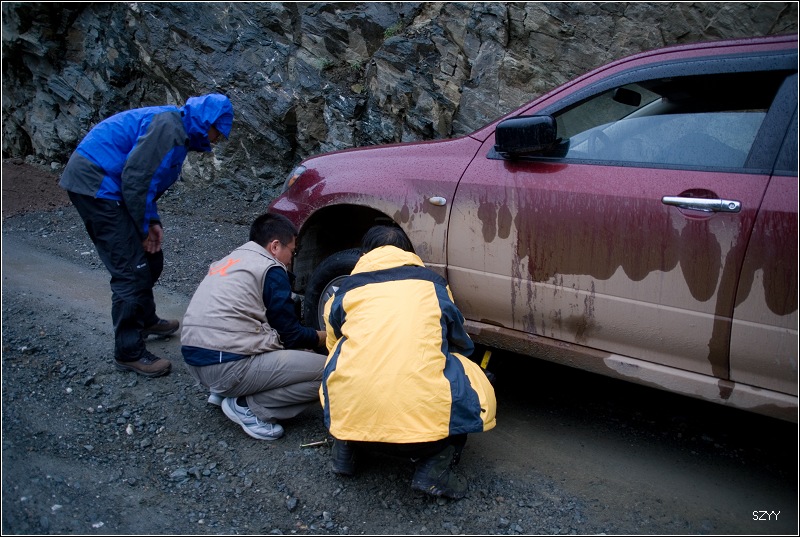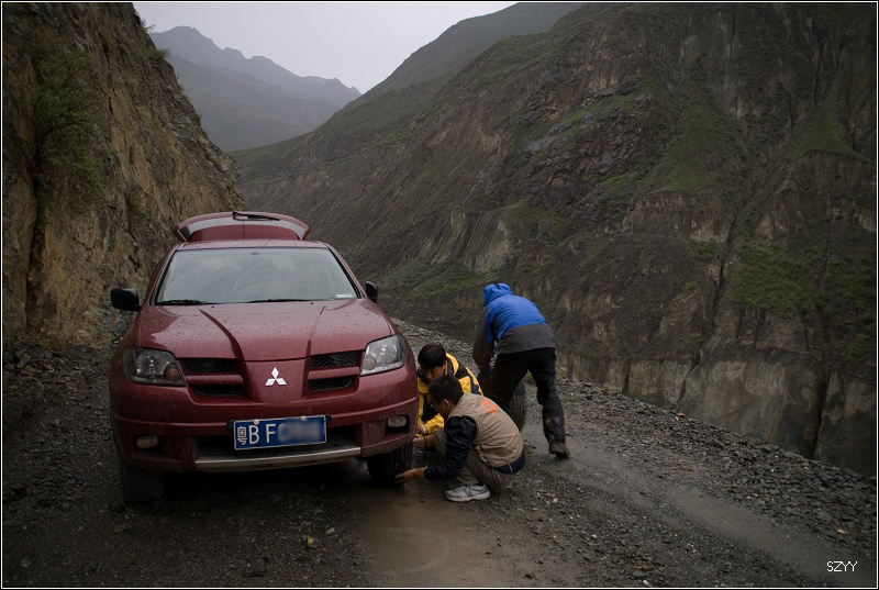 过了一段时间,追上老曲,他说光头他们等不及,归还了对讲机,先走了,我们继续在前面领路。 再走,又一次进入艰险路段,左侧是深深的金沙江大峡谷,浑浊的江水咆哮奔流,气势磅礴,右侧是万仞绝壁,怪石嶙峋,天下着蒙蒙细雨,泥路窄滑,可是我们实在抵御不住大峡谷的诱惑,冒险绝壁停车,拍拍峡谷的景色。老曲的车超了过去,从对讲机里说,我们的车轮胎似乎扁了,我们赶紧回头一看,不由倒抽一口冷气,果然,我们的左前胎已经完全没有气了,这可真不是时候,在这么危险的地方,山上随时会落石头,下着雨,天又马上就快黑了,怎么办?是勉强开出去找一个安全点儿的地方再换胎,可是前面看着都很危险,老曲他们的车略作停留,还是因为太危险,先开走了,达咏当机立断,决定马上换备用轮胎,大家一起动手,齐心协力,拿胎的拿胎,支千斤顶的支千斤顶,倒腾行李的倒腾行李,这时也不记得是谁了,把备用胎立着放在路上,等几个人忙着卸掉暴胎,老郎才发现,赶紧把备用胎放平了,好险啊,万一立着的备用胎没放稳,滚到金沙江的万丈深谷里,我们可就歇菜了。终于,换好了轮胎,整理好行李,可以继续前进了,整个过程历时20分钟,赶紧离开这个是非之地。