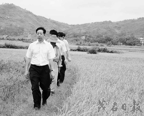 潘本一行首先深入树仔镇察看长水坑水库维修情况和莘陂村了解农作物灌溉等情况,随后赶到岭门镇检查指导抗旱工作。潘本每到一处都实地了解旱情,并仔细询问当前的旱情、农作物生长和灌溉等情况和详细听取当地领导关于抗旱工作的汇报。树仔镇长水坑水库,是一个可以灌溉2000多亩农田的小型水库。在认真察看该水库堤坝、护坡,了解维修情况后,潘本指出,现在正值汛期,要把防汛和抗旱工作一起抓好,加强水库的维修工作,及时蓄水确保解决农田灌溉用水问题。在树仔镇莘陂村,潘本一行深入田间地头,详细了解农作物生长和灌溉等情况。潘本要求,全县各镇各部门要采取切实有效措施,集中精力、人力、物力投入到当前的抗旱工作中去,千方百计引水抗旱,夺取早造作物大丰收。(何玉梅)