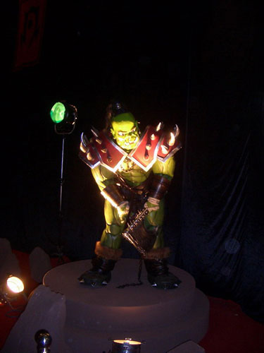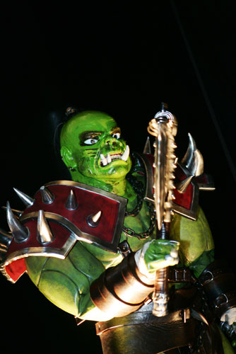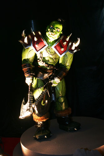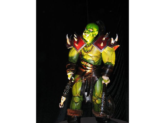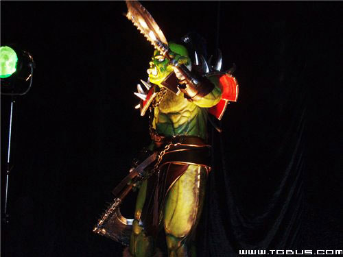 这是镜之人型工作室做的官方的魔兽世界的COS.天狼是其中的兽人.在WOW的2周年庆上穿的.当时热的鼻孔里吸进汗水喷出汗水.头发最后可以搅干.服装脱下后,没有一个地方不能滴汗的.因为全封闭,只有鼻孔很小的洞,所以差点没窒息死 服装本身大部分是硅胶和EVA树脂制作的.关节弯曲比较累...
