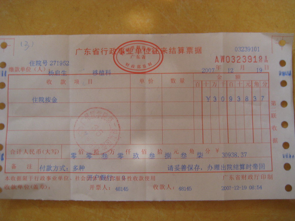 募捐账户余额(未含徐长卿收的现金捐款)30938.37已通过网上银行转帐到广州医学院第二附属医院账户,大约24小时到达医院账户。