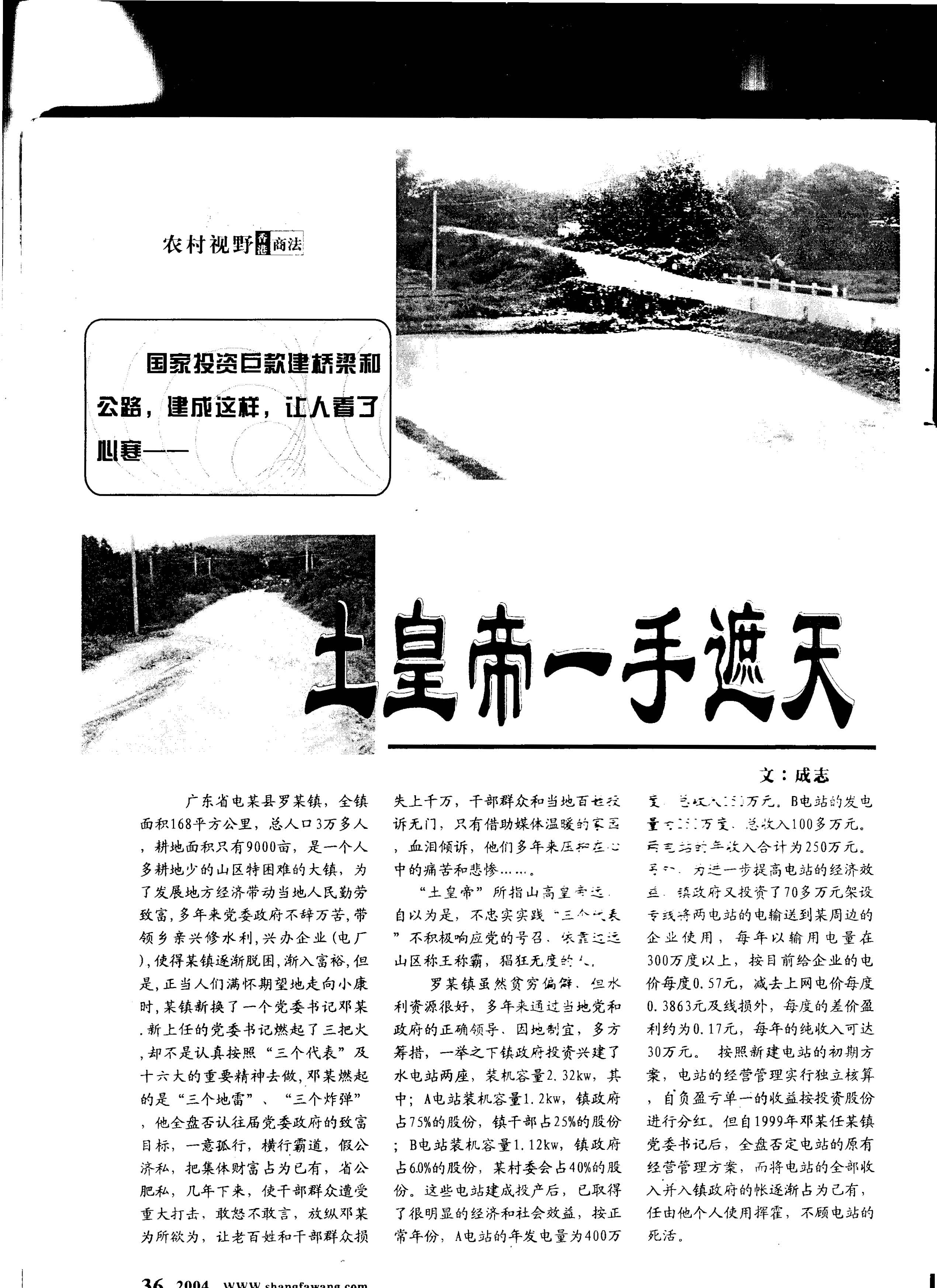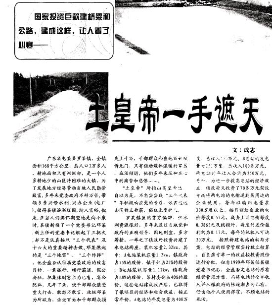 广东省电某县罗某镇,全镇面积168平方公里,总人口3万多人,耕地面积只有9000亩,是一个人多耕地少的山区特困难的大镇,为了发展地方经济带动当地人民勤劳致富,多年来党委政府不辞万苦,带领乡亲兴修水利,兴办企业(电厂),使得某镇逐渐脱困,渐入富裕,但是,正当人们满怀期望地走向小康时,某镇新换了一个党委书记邓某.新上任的党委书记燃起了三把火,却不是认真按照“三个代表”及十六大的重要精神去做,邓某燃起的是“三个地雷”、“三个炸弹”,他全盘否认往届党委政府的致富目标,一意孤行,横行霸道,假公济私,把集体财富占为已有,省公肥私,几年下来,使干部群众遭受重大打击,敢怒不敢言,放纵邓某为所欲为,让老百姓和干部群众损失上千万,干部群众和当地百姓投诉无门,只有借助媒体温暖的家园,血泪倾诉,他们多年来压抑在心中的痛苦和悲惨……。