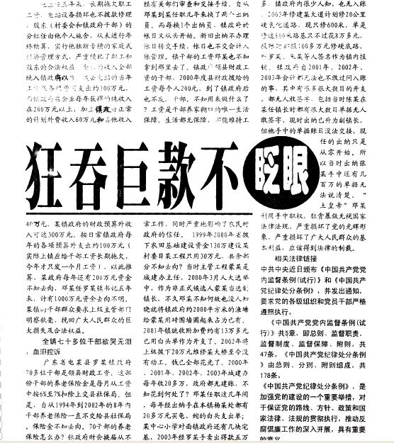 镇政府自2001年、2002年、2003年会计都无法也不敢过问入账的事,其小有很多很大数目的开支,都无人敢签字包括当时陈某在某任镇长时都有很大数目单据无人敢签字,现时出纳已升为副镇长,但他手中的单据账目没法交接,现任的出纳只是从零开始。所以当时出纳张某手中还有几百万的单据无法说清楚。“土皇帝”邓某利用手中职权,狂贪暴敛无视国家法律法规,严重损坏了党的光辉形象,严重损坏了广大人民群众的基本利益,应该得到法律的制裁。