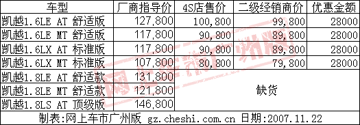 凯越的1.8发动机产量严重下降,导致1.8排量的凯越货源奇缺,每家广州的4S店,每月只供应两辆,这是否与厂家的销售策略有关就暂时不得而知,因为早前1.8不缺货的时候,1.8和1.6排量的凯越销量比重大概是2:3,证明1.8排量还是有市场的。而另一方面,1.6排量的别克凯越供货十分充足,而且优惠幅度很大,二级经销商优惠更达到28000元,性价比超高。