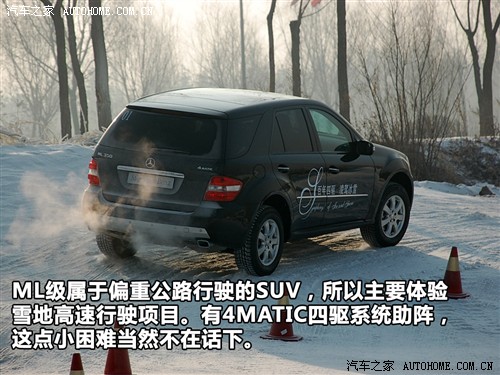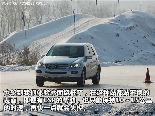 在冰雪体验中,我们尝试了驾驶ML级在雪地中以40~60公里的时速疾驰,途中有加速、刹车、连续S型弯道、调头弯、紧急避让和冰面绕桩等项目。在亲身体验前很难相信在这种路况下车辆能保持高速行驶。试过之后才发现,不仅加速刹车都不成问题,高速S弯也很轻松。