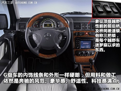 拉开厚重的车门,G55的内饰如同它的外表般硬朗。但仔细品味,它有细腻的皮革,精巧的木质内饰,全方位的舒适配置以及不折不扣的梅赛德斯-奔驰水准的做工。当然在越野车狂热者看来这些都是次要的,他们看中的是空调出风口旁边的三个按钮,前后桥及桥间差速锁的开关,这才是顶级越野车的标准配置。