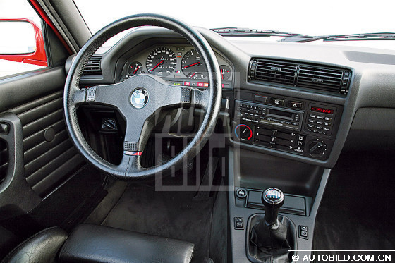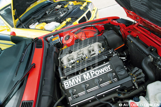 我们先来看最新款M3,它的厂家内部编号是E92。它搭载的是一款在M3的发展史上首次出现的V8发动机,最大功率可达420马力,是最早一代M3的两倍多。1986年面世的第一代M3,即E30配备的是只有200马力的2.3升四缸发动机,而且没有采用废气增压技术。我们的测试用车产自1987年,从博物馆里开出来后还能达到195马力,魅力依旧,光彩照人。方头方脑的车身造型、宽大的挡泥板和后导流板使E30在80年代风靡一时。即使用现在的目光来看,充分考虑了人体工程学的内饰设计仍然十分出色。中控台略微偏向驾驶员,所有的按钮都可以发光。可是为什么宝马公司把这么一个好的产品停产了呢?转动点火钥匙,立即就让人忘了宝马引以为豪的iDrive信息控制系统。启动时没有常见的隆隆声,四缸发动机很快进入怠速空转,发出的声音就象微笑一样含蓄。充分的暖车之后,E30在高速公路上可以毫不费力地超过时速200,考虑到测试用车已经比较旧了,我们没有测试是否能达到厂方宣称的最大转速7300。