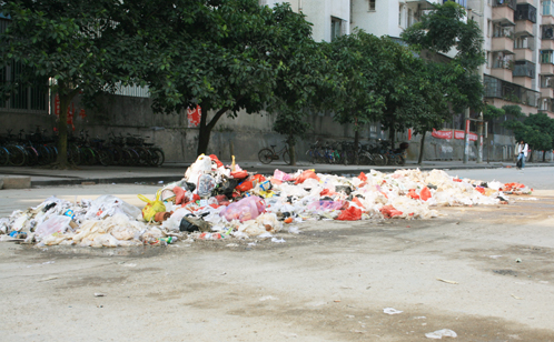 这张图是在电海中学后门与杨梅小学正门之间的宽10米的水泥硬底大道上拍摄的,宽10米的大道中间竟然成了周边铺位与小区的垃圾场,而且长期如此,这是谁的过错?