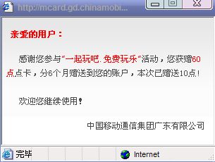 [attachmentid=165361]电白老乡们,一起去http://mcard.gd.chinamobile.com/portal/web/recommendRegAction.do?linkid=10001261148领取点数啦,登陆即送60点,50点分5个月送,1点相当于1元话费,没介绍错咖,3月31日结束,抓紧时间啦