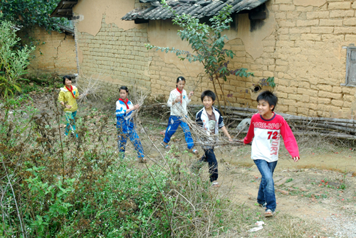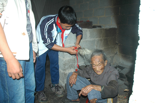 这是一个百岁老人居所的外景,三间老房早已崩塌。现在居住的水泥砖房是她的女儿及乡亲们建造的。