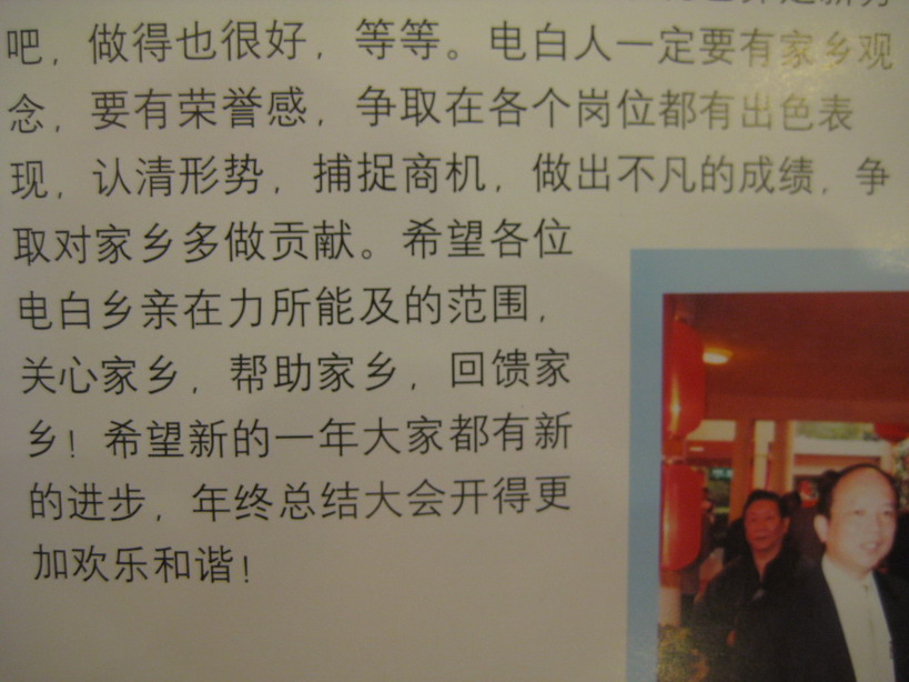 四中乐叔 版主 版主 注册 2006-05-06 消息 6,725 反馈评分 3 点数 61 2008-03-31 #37 “同唱和谐之歌”--振兴电白广州联谊会2008年年会 -------------------------------------------------------------------------------- www.dbtxw.com 发布时间:2008年03月31日 10时00分 合影 全国人大代表、执行会长崔真基步入会场 会长刘寿华在讲话 电白县常务副县长庞进生在讲话 原省人大教育科学文化卫生委员会主任委员许光辉在讲话 深圳电白乡亲联谊会会长廖寿伦在讲话 谢申奖学金创办人谢申之子谢昭在讲话 会长刘寿华向今届执行会长崔真基、下届执行会长李琼兴颁发证书 曲艺演奏 国粹变脸表演 【电白同乡联谊网】讯:(杨子章、摄影 谭文邦)3月29日下午,正是一个春光明媚的日子,振兴电白广州联谊会2008年年会在广东迎宾馆举行。许光辉、廖寿伦、蔡端丰、钟正书、王业俊、庞进生、阮汉、陈森、唐启运、崔真基、崔雅基、李富、崔广德、郑文、李琼兴等政商文化界人士和深圳、东莞、惠州等各地同乡会负责人以及电白籍各界老领导老同志,各界名士贤才将近300多人共聚一堂。 本次大会由崔真基主持。刘寿华会长在会上作了工作报告,就联谊会2007年的工作作了详细回顾并提出了2008年的工作设想。 电白县常务副县长庞进生、原省人大教育科学文化卫生委员会主任委员许光辉、企业家李琼兴、深圳电白联谊会会长廖寿伦、谢申教授之子谢昭等先后在会上作了精彩的讲话。 文艺工作者表演了演奏、歌舞等精彩节目。 这是一次为建设和谐美好电白群策群力的盛会。 (责编:杨子章)
