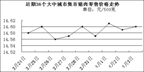 中新网4月7日电 国家发改委网站消息称,据国家发展改革委价格监测中心监测,上周(3.31-4.4,下同)全国36个大中城市集市猪肉(精瘦肉)平均零售价格每500克为14.59元,比前一周(3.24-3.28,下同)上涨0.07%。