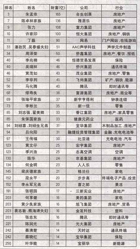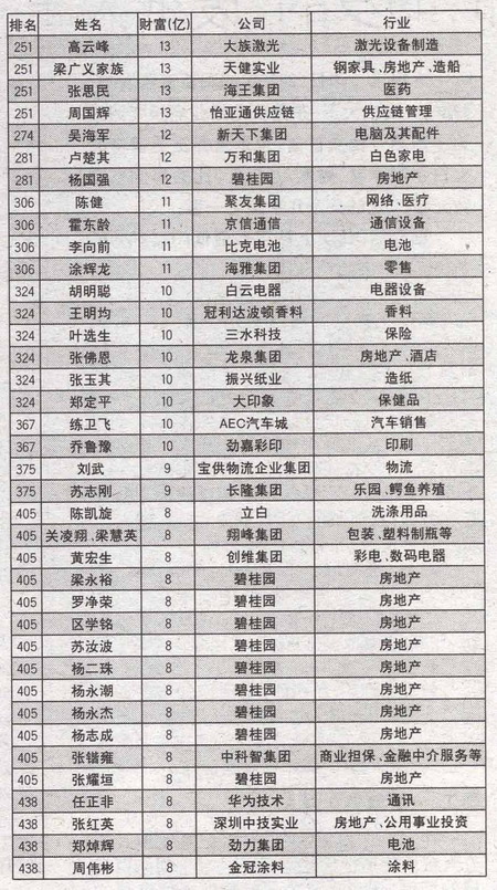 在昨(11日)日公布的《2006胡润百富榜》500名富豪中,广东有74位富豪上榜(详见下表),其中4人进入前十位,分别是:第三位合生创展董事局主席朱孟依,拥有财富165亿元;第七位雅居乐的陈卓林家族,拥有财富136亿元;第九位富力集团的张力,拥有财富108亿元;第十位恒大集团的许家印,拥有财富100亿元。网易的丁磊以9 0亿元排在第十一位。