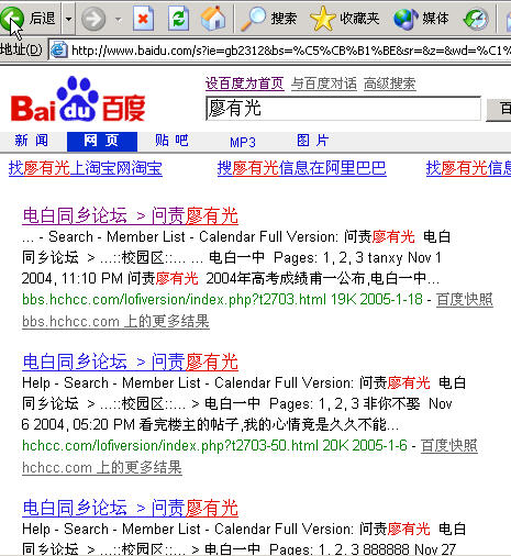 今天想搜索一下廖校长的名人好事,在全球第一大中文搜索引擎试试输入廖有光,搜索的结果真是大吃一惊。 [attachmentid=9527] 再试试搜索人渣校长,哇!!大跌眼镜啊 [attachmentid=9528] 此论坛真的能让人一夜之间成为名人