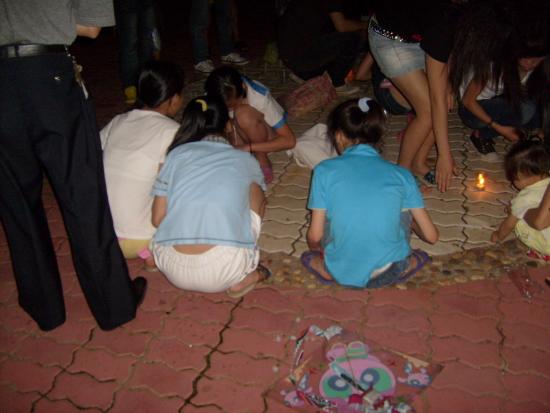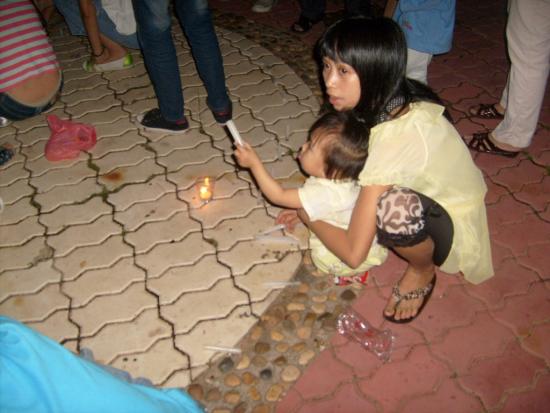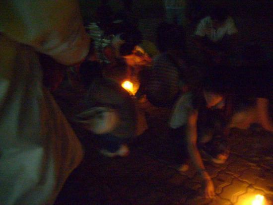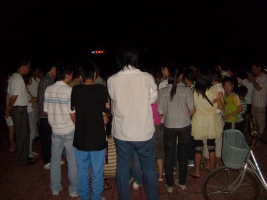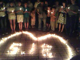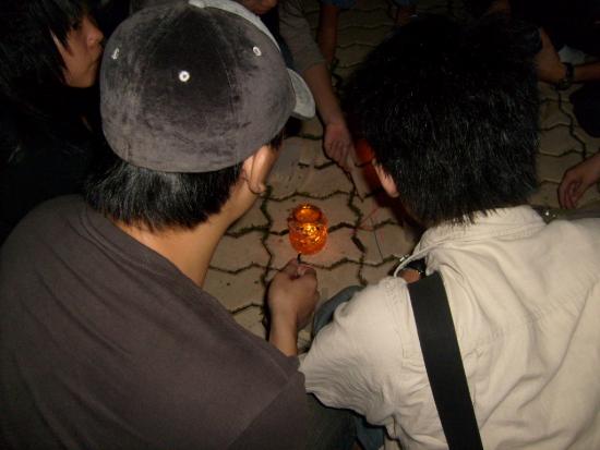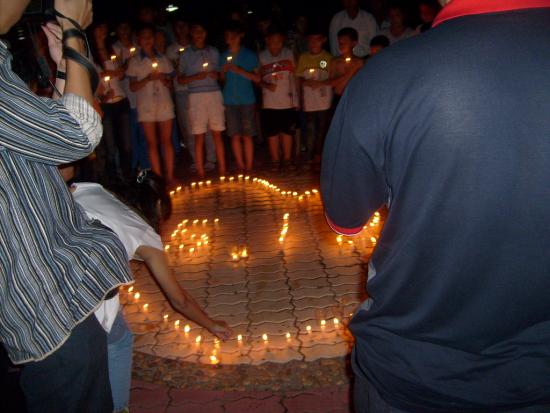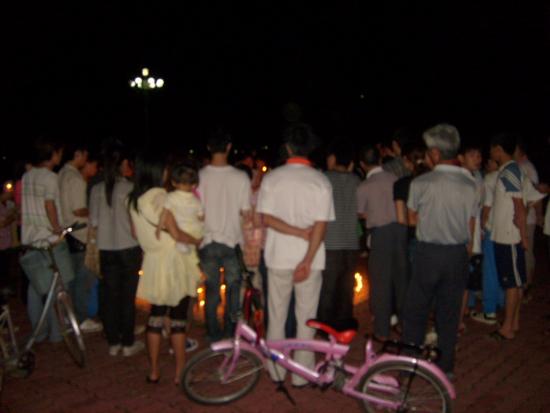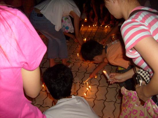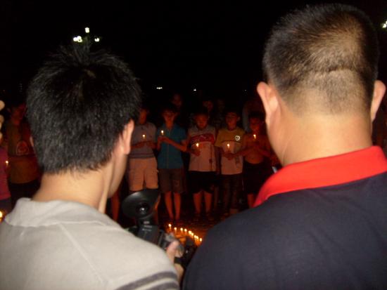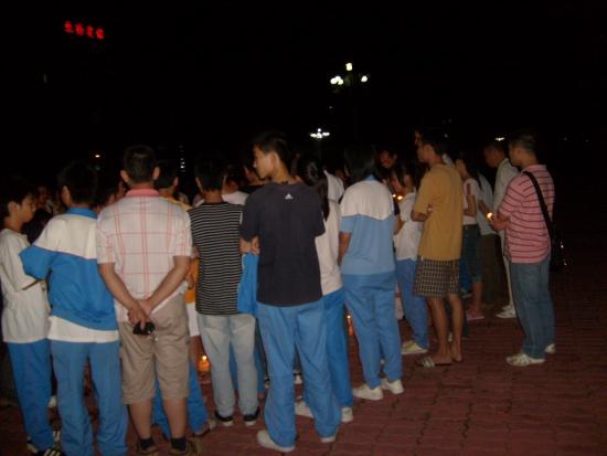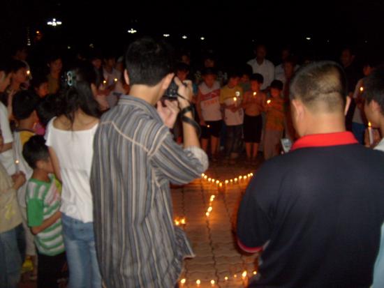 08年5月21日晚9点左右,我经过东湖看到草平那边有些人踹着或站着忙碌,而且还有点烛光,我不由自主地走了过去,看到人们都在用蜡烛在地上排一个还没排完整的心形,就情不自禁地踹了下去帮忙,慢慢的人越来越多,好快地上的蜡烛都排好了,中间还有5.12的字样.大家点燃了地上的蜡烛,很多跟我一样路过的市民都过来领蜡烛,我们拿着手中的蜡烛点燃.开始了,人们都低着头默默地为汶川祈福,为大地震遇难的同胞深切哀悼.数分钟后在一个人(呵呵,不知道这个是谁,反正我不认识)的主持下喊出了口号:中国加油!汶川加油!北京加油!奥运加油!电白加油!