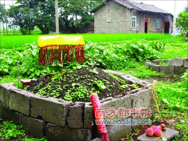 吴家方:5月14号。她12号遇难,到13号一直下雨。一直下雨就没把她带回来。我13号晚上就想,今天背不成,14号再下雨,我都要去把她背回来。所以14号,老天也给我一天时间。我就去把她背回来。背回来,当天下午就把她埋了。村子有专门的坟墓,我没有送她到那里,就埋在我门前,(这样)我能够看得到她。而且山上坟墓很多,以后我更不得跟她(埋)在一起;单独在这个地方,我老死就可以跟她(埋)在一起了。