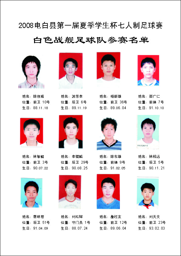 祝2008电白县第一届夏季学生杯足球赛完满成功。。。。! 比赛成绩: 冠军:高州卡士2足球队 亚军:电白云枫菲足球队 季军:电白德联足球队 殿军:茂名GPSX足球队 最隹射手:高州卡士2足球队 12号 李小国