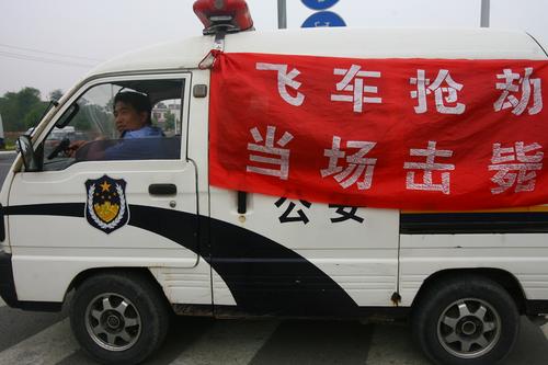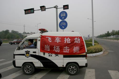 2007年5月30日,郑州中原西路郑州与荥阳交界处,荥阳市公安局豫龙镇派出所民警持枪值勤,在警车上挂起“飞车抢劫当场击毙”红色条幅震慑不法分子,夏季是飞车抢劫的作案高发期,警方为了震慑不法分子在快速路上提前布岗预防。但是此种做法也引起市民的不好评价,民警不去破案而在此守株待兔。