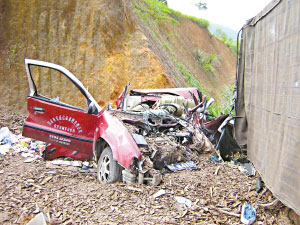 本报信宜讯(记者关家玉 通讯员吴祖光)昨天凌晨4时许,国道207线信宜池洞镇铜鼓岭路段发生一起交通事故:一辆大货车下坡时失控侧翻,冲过左边的对向车道,与对向行驶的而来的一辆茂名牌出租车发生猛烈相撞,致出租车上5人当场死亡,大货车上2人受伤,两车严重损坏。