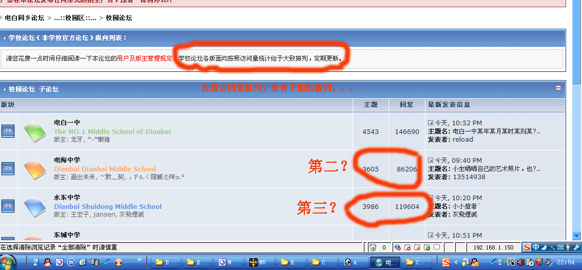 “学校论坛各版面均按照访问量统计给予大致排列,定期更新。”这是论坛的规则!但是我观察这个两三年了,就一直没变! 现在人家水中老早就超过了电海,但是电海还排在水中前面! 声明:这是原则问题,不是BS电海!如果你电海超过一中的,也可以排名第一!希望管理员更新版块排列!