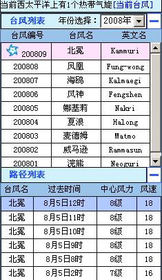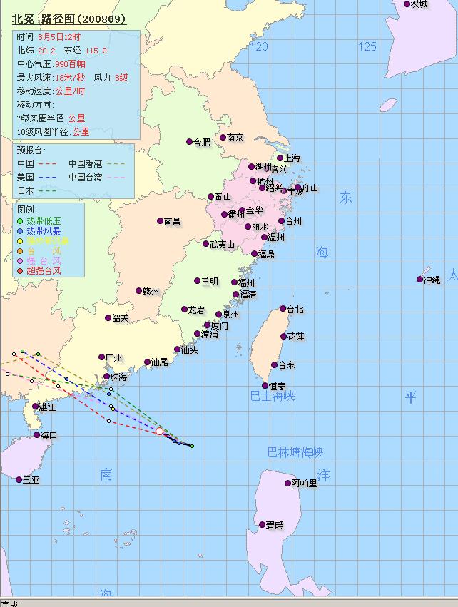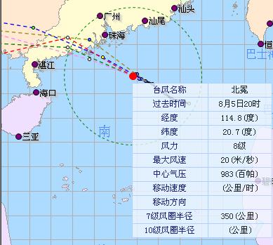 2008-08-05 今年第0809号台风(北冕) 08月05日12时(北京时间),此台风的中心位置在北纬20.2度,东经115.9度,中心气压 990百帕,近中心最大风速18米/秒,移向 WNW ,移速 15公里/小时,七级大风圈半径320公里.