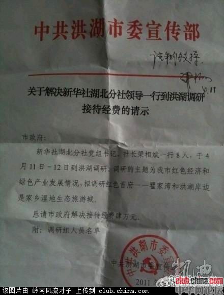 洪湖市委接待新华社领导 8人2天花4万(有文件有名单)转自中华网