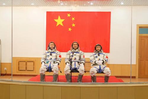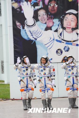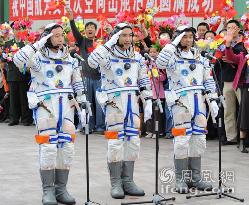 [胡锦涛]:翟志刚、刘伯明、景海鹏同志你们好,神州七号飞船就是按原定计划发射了。你们即将出征,执行我国第三次载人航天飞行的任务,在这里我首先代表党中央、国务院、中央军委,也代表全国各族人民来为你们壮行,预祝你们成功!