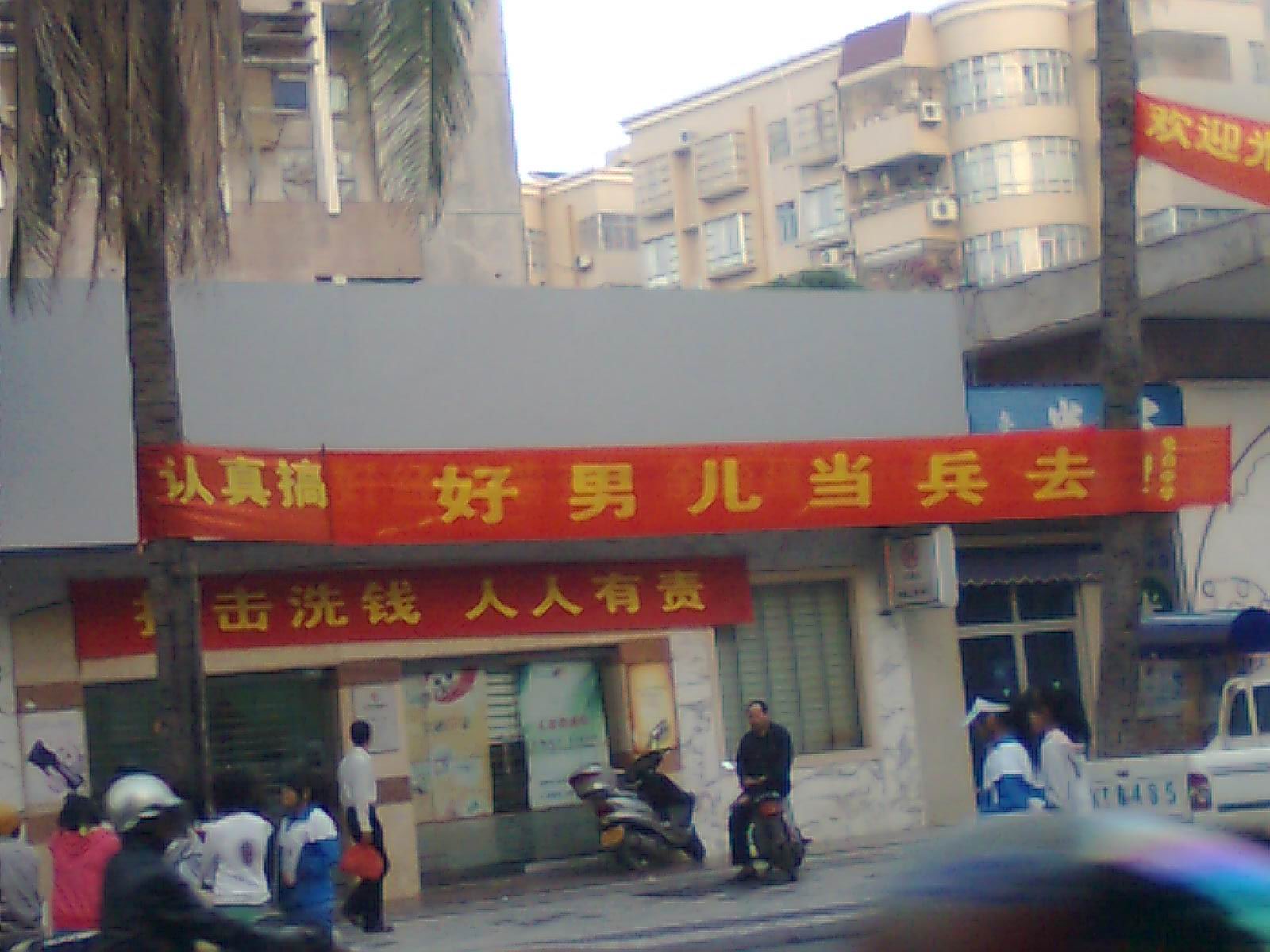 4.电#中学“认真搞女子,男儿当兵去!击(鸡)洗钱,人人有责!”新标语。