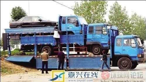 江嘉兴市区原蔬菜和水果批发市场西边的路旁,4辆不同型号的车叠在一起。据旁边1名司机介绍,这4辆车同去山东,考虑路程太远,车子叠装在一起省油省过境费。