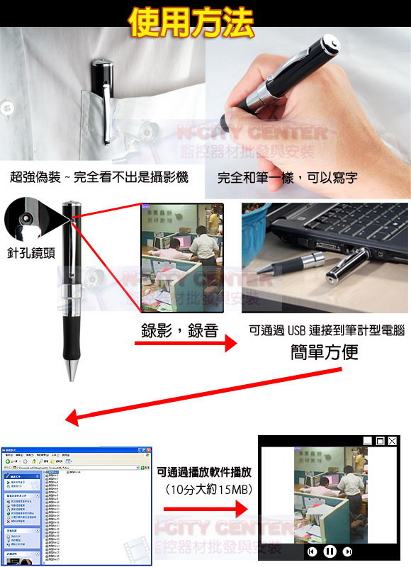 2.高灵敏度的麦克风,在15平方米之内都可清晰的把声音录下来;高清晰的摄象效果,精美的外观,流畅的圆珠笔书写功能,可替换的标准笔芯,耐用环保。