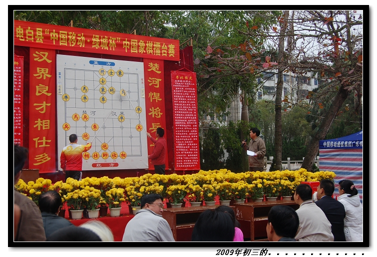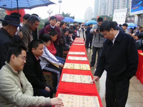 1月29日(牛年春节大年初四)上午,惠州市下埔滨江公园中心舞台热闹非凡,彩旗飘扬,音乐放声,棋友棋迷欢聚一起,由惠州市体育总会和市棋类协会联合举办的2009年惠州迎春象棋特级大师车轮应众表演赛,在这里隆重举行。