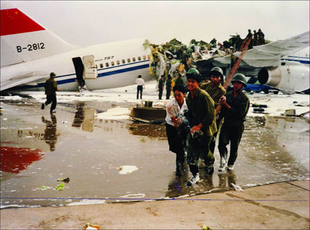 有人回忆说,当时机舱广播称是航空管制,请大家耐心等待。大约9点左右,“突然听到一阵刺耳的怪叫声,透过窗户看见一架飞机歪歪斜斜地俯冲下来,并一下子冲出跑道,随后就听见很大的爆炸声。”记者们回忆说,当时他们才意识到是飞机失事了。出于职业习惯,几个同伴扛着摄像机就往外冲,但是被乘务员拦下。一个电视台的人试图用“大哥大”通知单位,亦被劝阻。“其实最关键的是当时呼叫也没有回应,”直到大约两个小时后,所有机上乘客才获准离开。