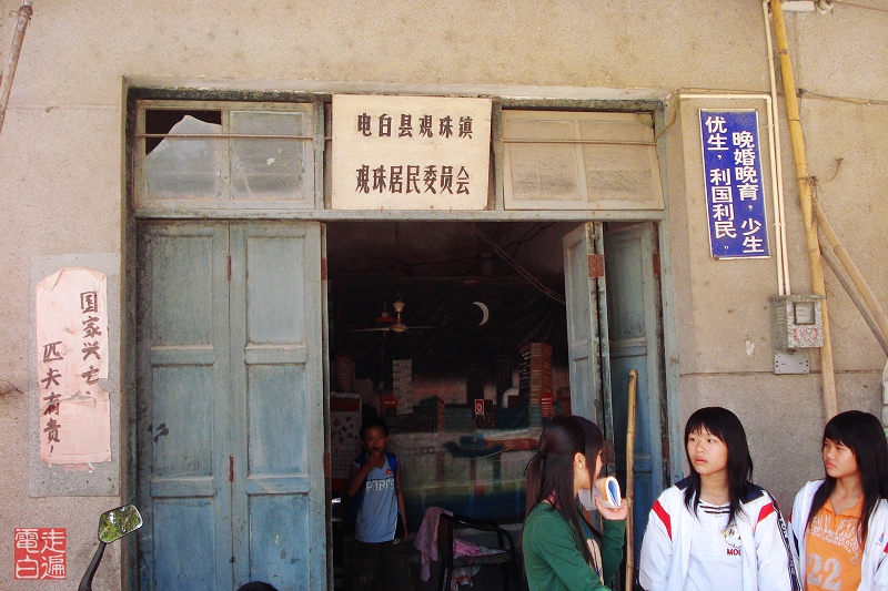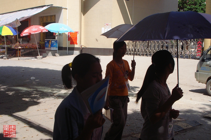 在学校对面等待进校的学生。学校的门是开的,但是没有学生进校。看来很遵守纪律。