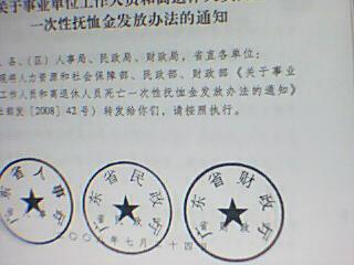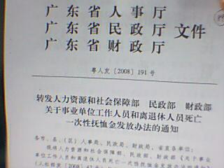 电白财政局对电白信访局的答复(2008年10月20日):“我县根据实际情况,事业单位也参照国家机关从2007年10月1日起发放由财政供养人员的死亡抚恤金”