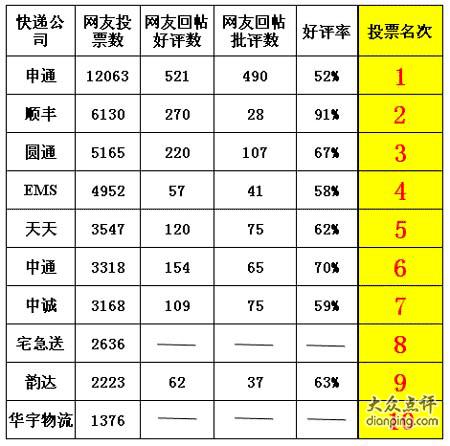 QUOTE(仔仔 @ 2009年04月23日 Thursday, 03:26 PM) 电白水东有什么快递公司,想寄点东西上广州增城!有知道的提下 [snapback]2749687[/snapback] 申通圆通韵达顺丰EMS... 印象中用过的就这些 附表中国十大快递公司排行榜